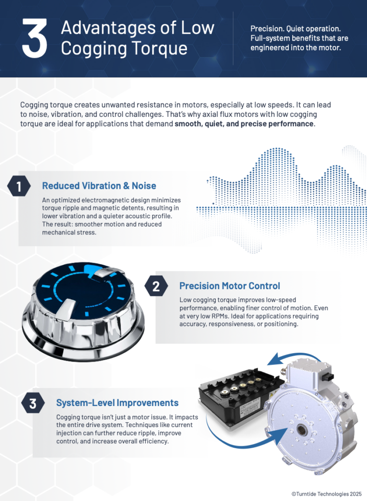 Cogging torque plays a critical role in motor performance. It challenges the precision control of a motor and induces vibration and jerkiness in the application. An axial flux motor with low cogging torque delivers many advantages. Three of those are illustrated in this infographic.