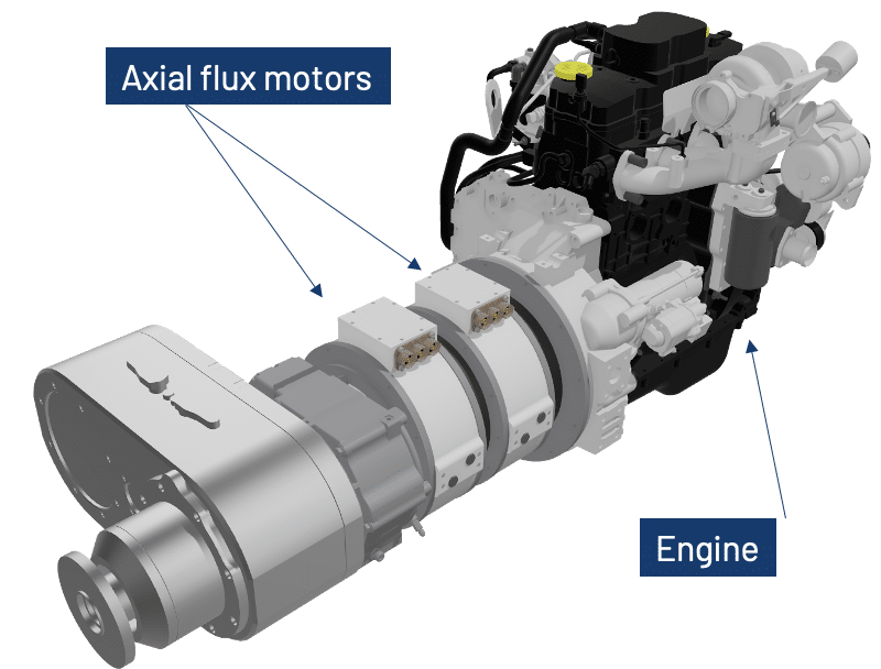 Using an axial flux motor in this system improves packaging and performance. Its disc-like geometry supports in-line integration in limited axial space, often with minimal drivetrain rework. High torque density and low rotor inertia improve transient response and torque smoothing during engine start/stop and gear shifts, while the motor’s strong, low-speed torque can reduce required gear ratio spread and enhance gradeability and work-cycle control.